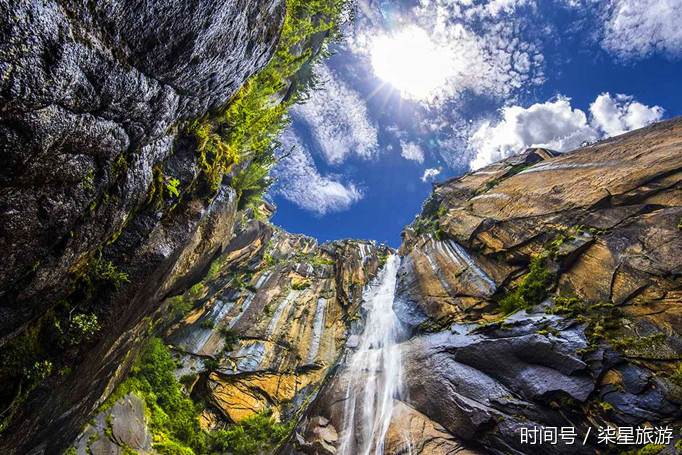 卡定沟,是典型的峡谷地貌,奇峰异石古树参天,落差近200米的瀑布飞流直下雄伟壮观。在这个景区里面游览需要徒步而行,可以直接沿着这条栈道前行就可以了。沿途都是古树、瀑布、水潭、石山和竹林,感觉走在潺潺流水的的小溪谷里面一样,非常的惬意。