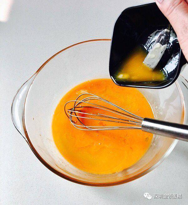 3, 打发蛋白,打至奶油状态,稍硬挺即可,打出有尖峰状,蛋白分两次拌入蛋黄中,用上下切拌法,顺时针转动会消泡的哦。