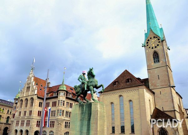教堂前面,一座骑马男士的雕像是曾经担任过许多年苏黎世市长的汉斯·瓦尔德曼(HansWaldmann,1435-1489年)。
